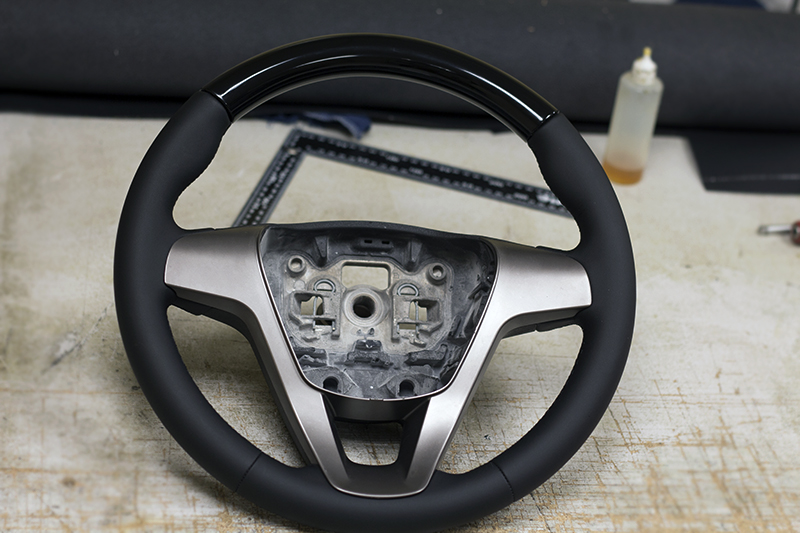 Изготовление вставки рояльного лака в руль LADA Vesta. Руль перетянут натуральной кожей наппа.