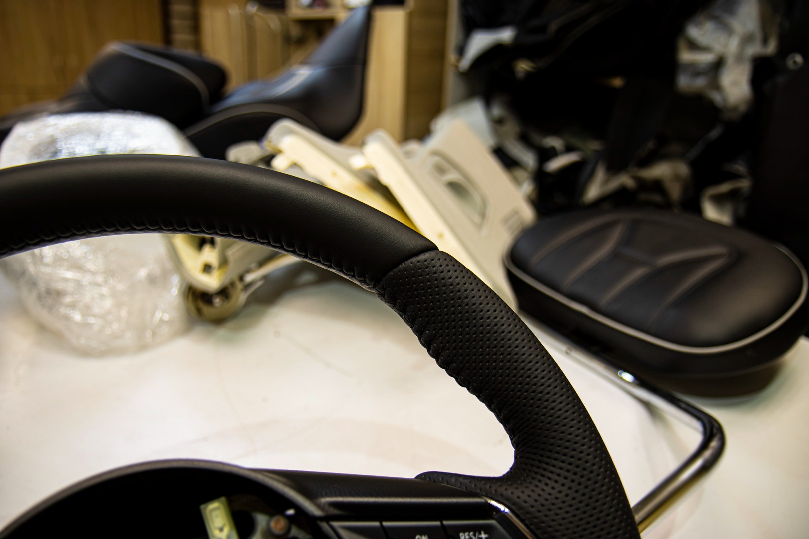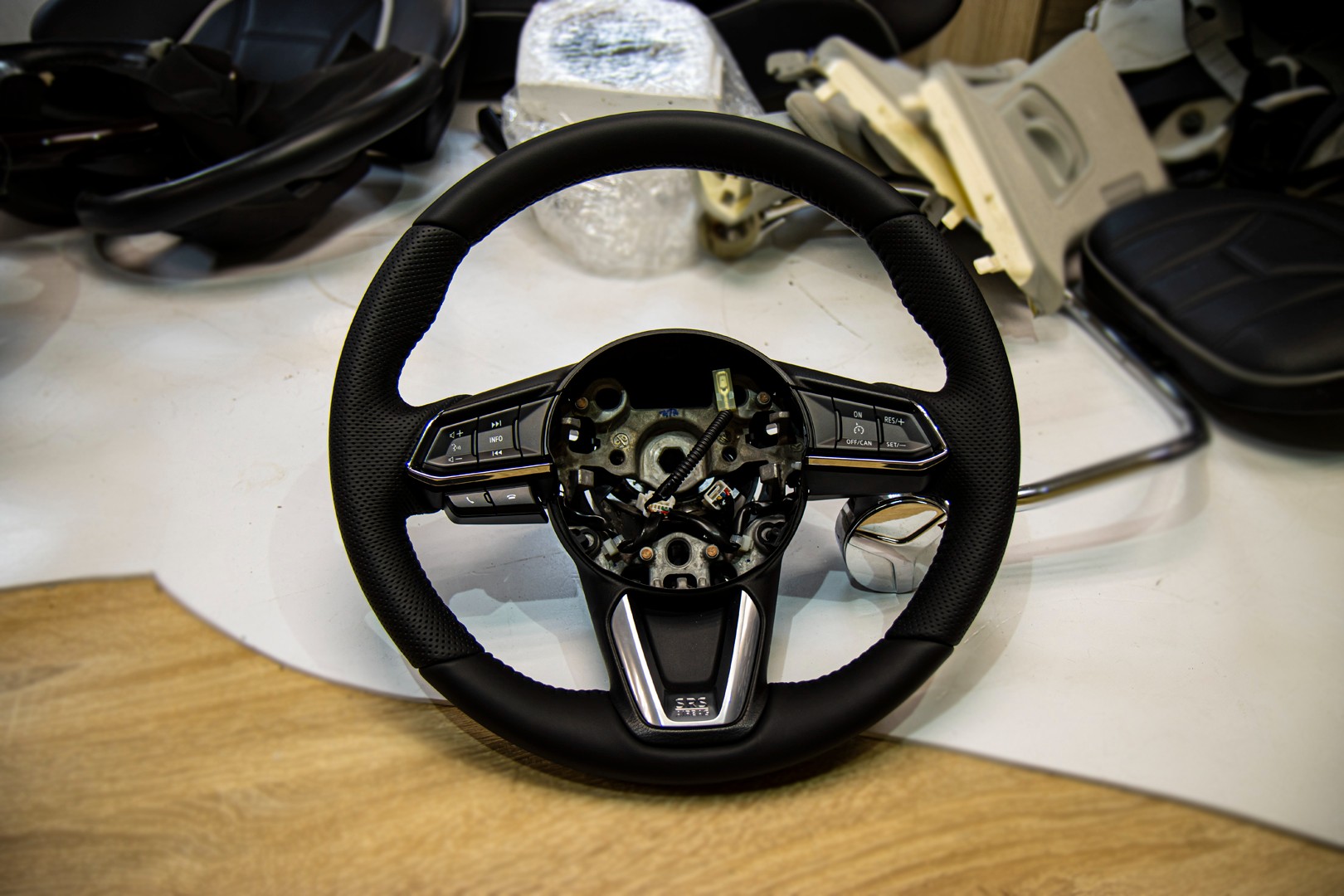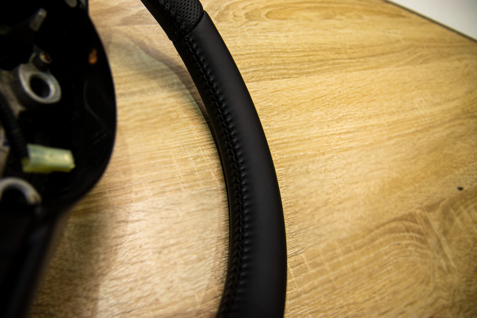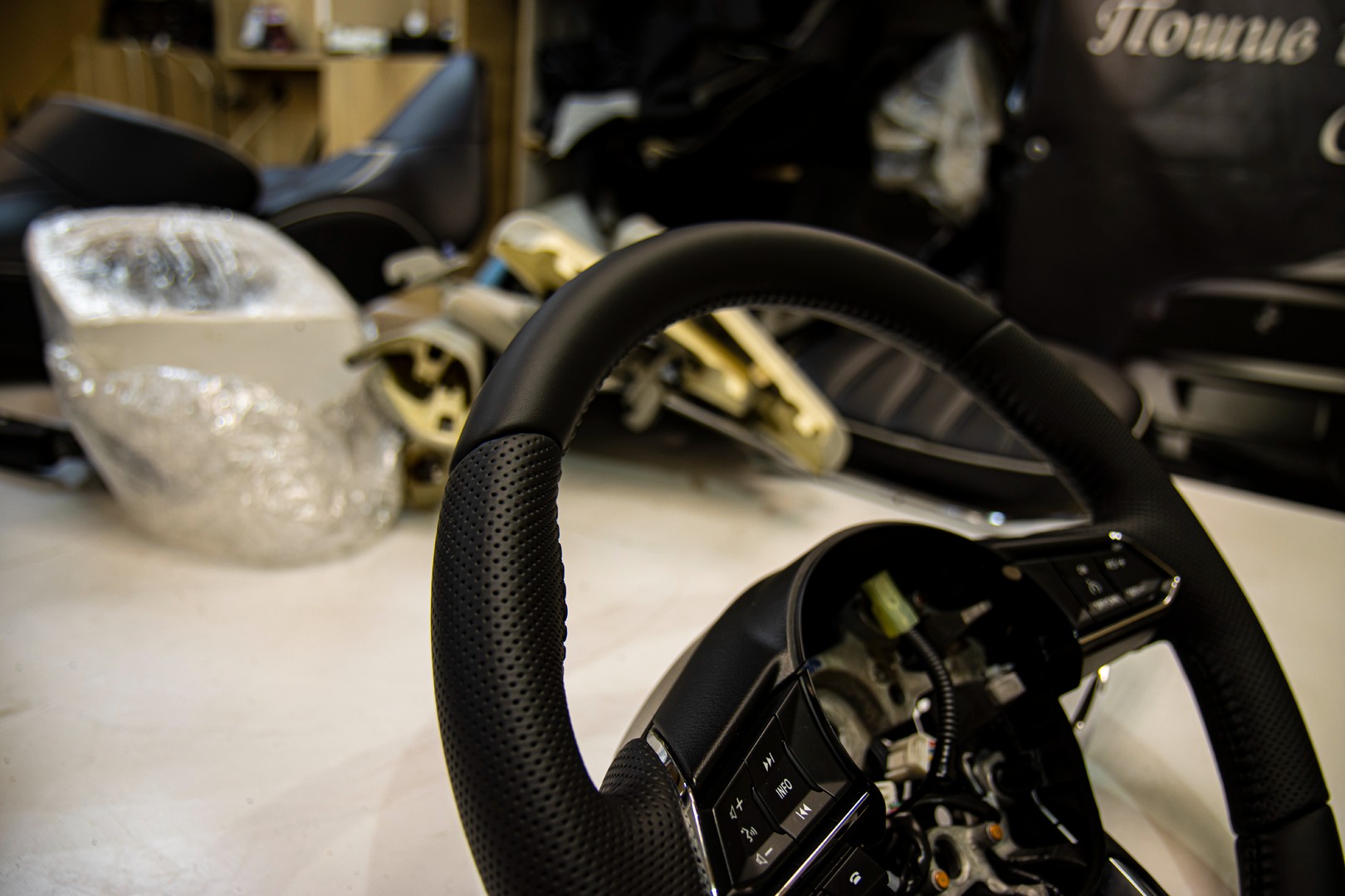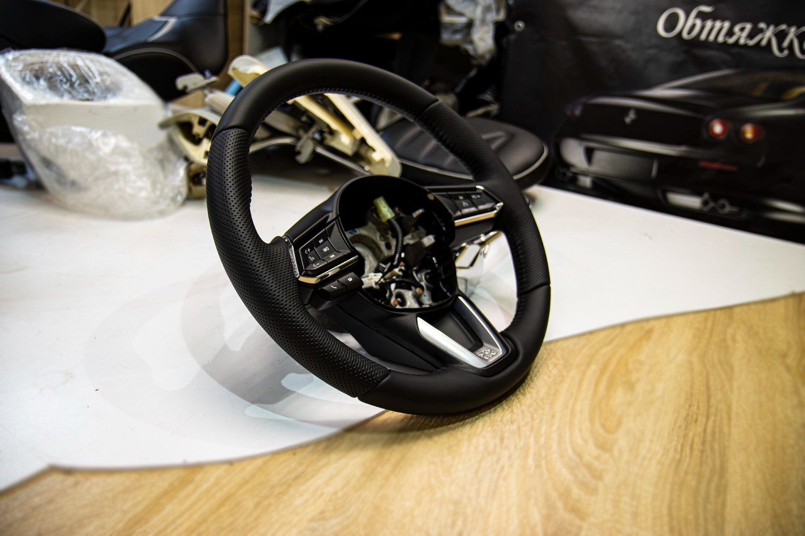 Перетяжка руля для автомобиля MAZDA CX-5 (2G). Материал используемый при перетяжке руля - это натуральная автомобильная кожа NAPPA. Руль перетянут с сохранением заводских "косых" швов и отделочного шва коса.