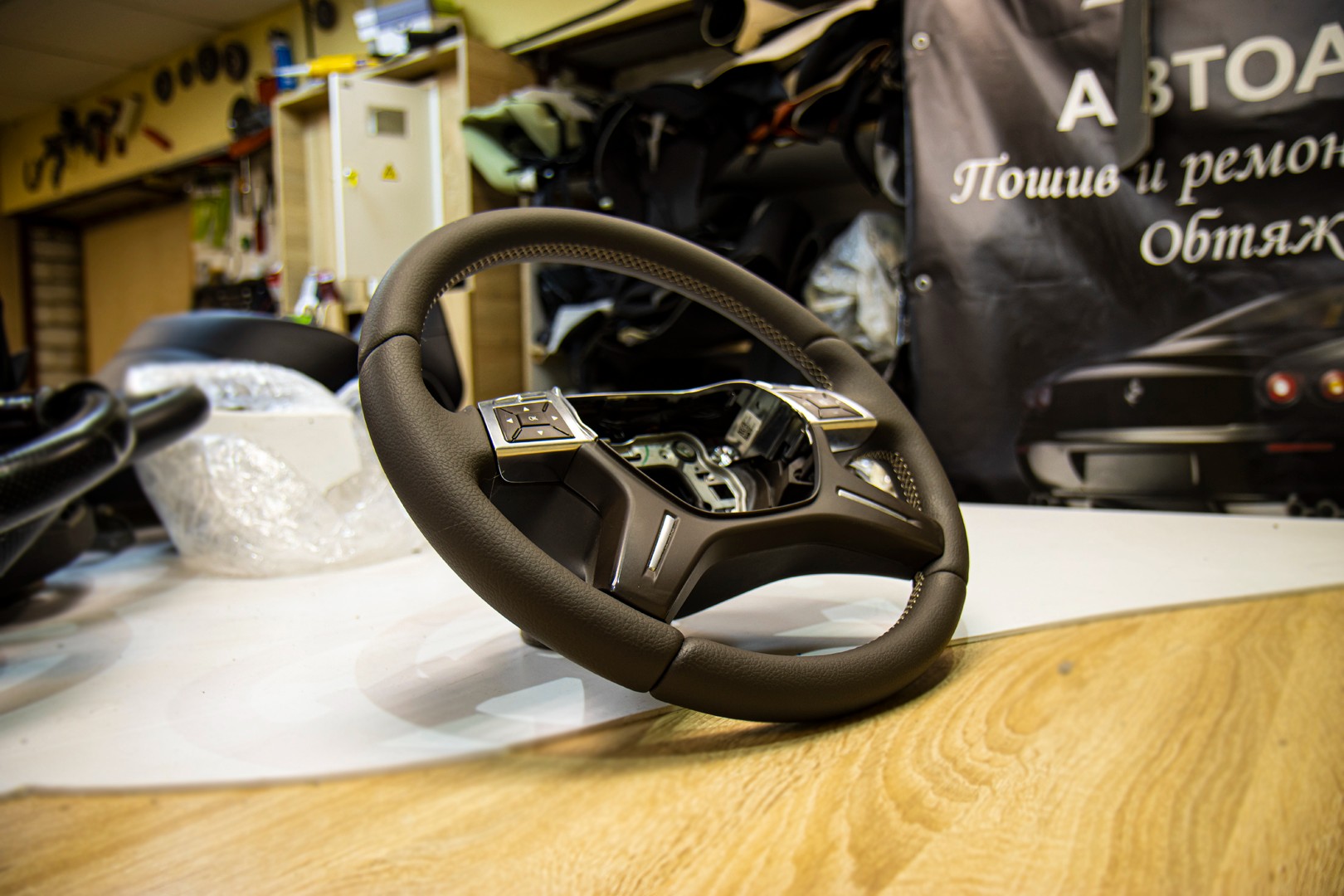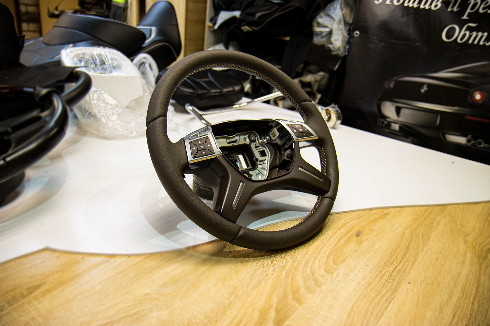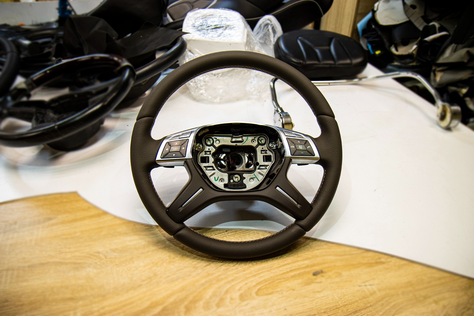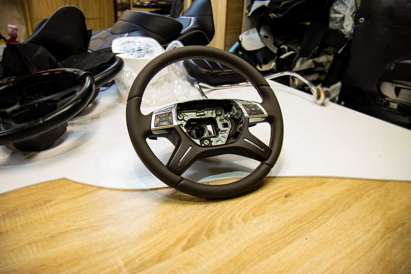 Перетяжка руля для MERCEDES GL w164. Заменена мягкая подложка, устранен прокрут руля. Материал используемый при перетяжке руля - автомобильная эко-кожа на микрофибре.