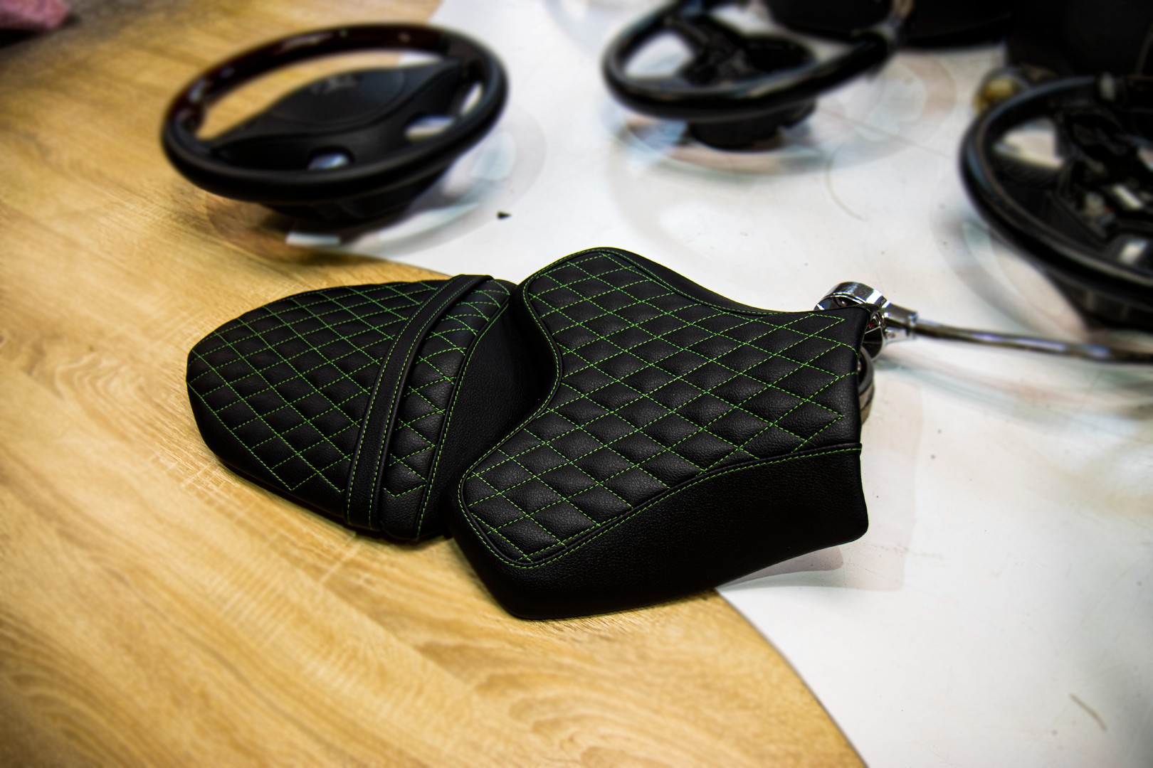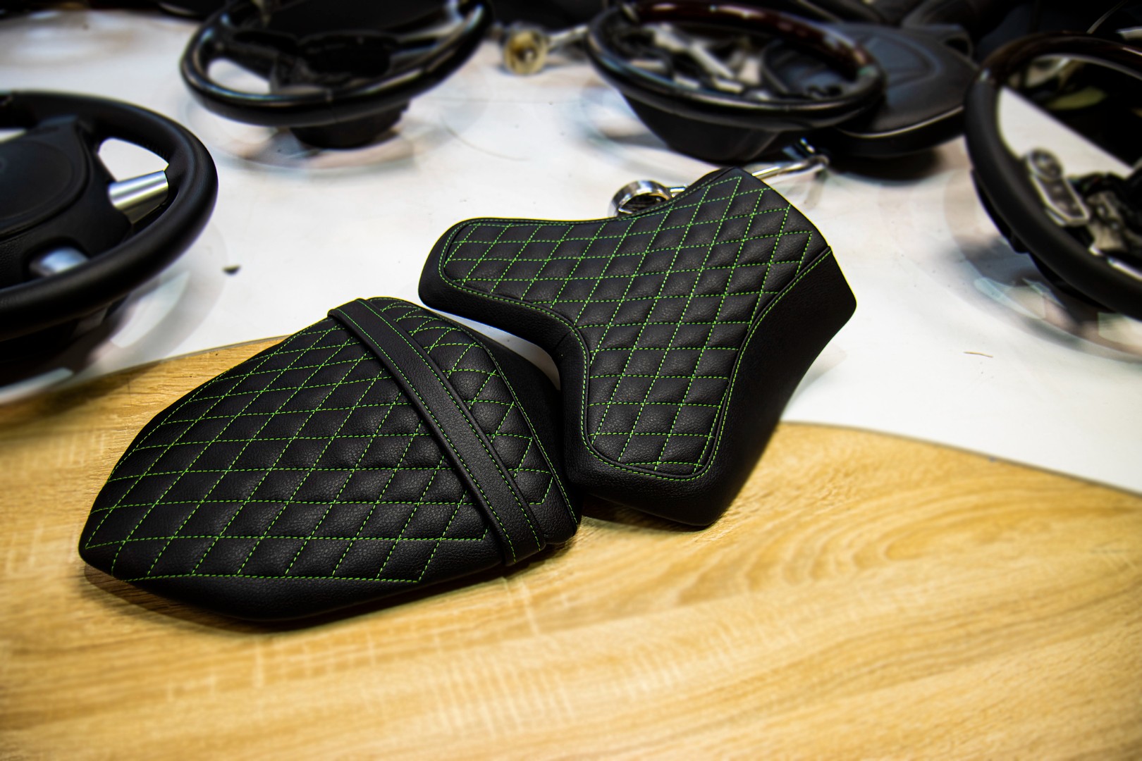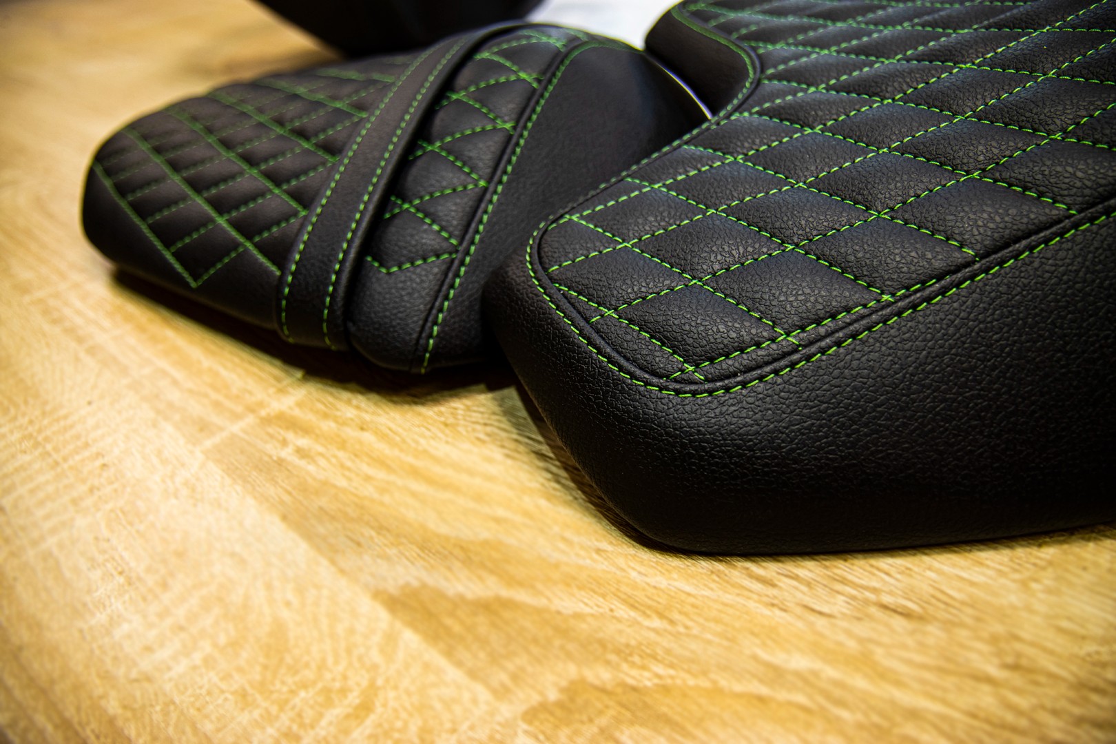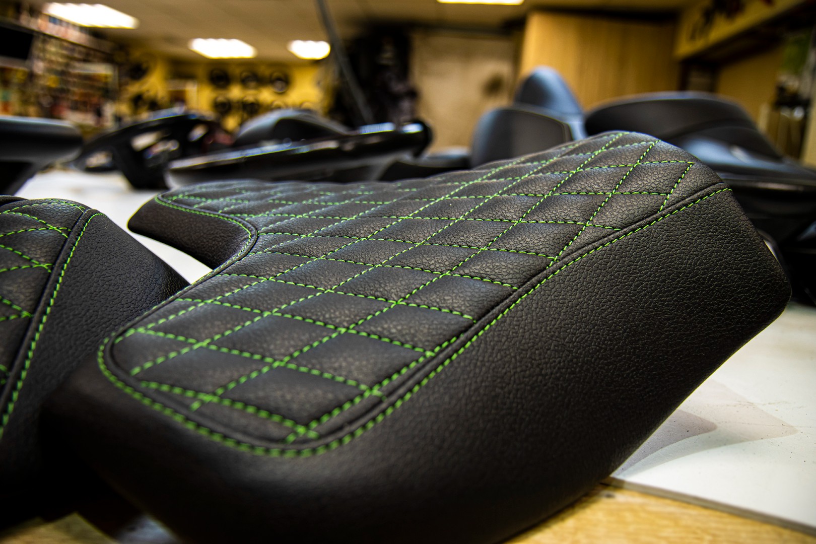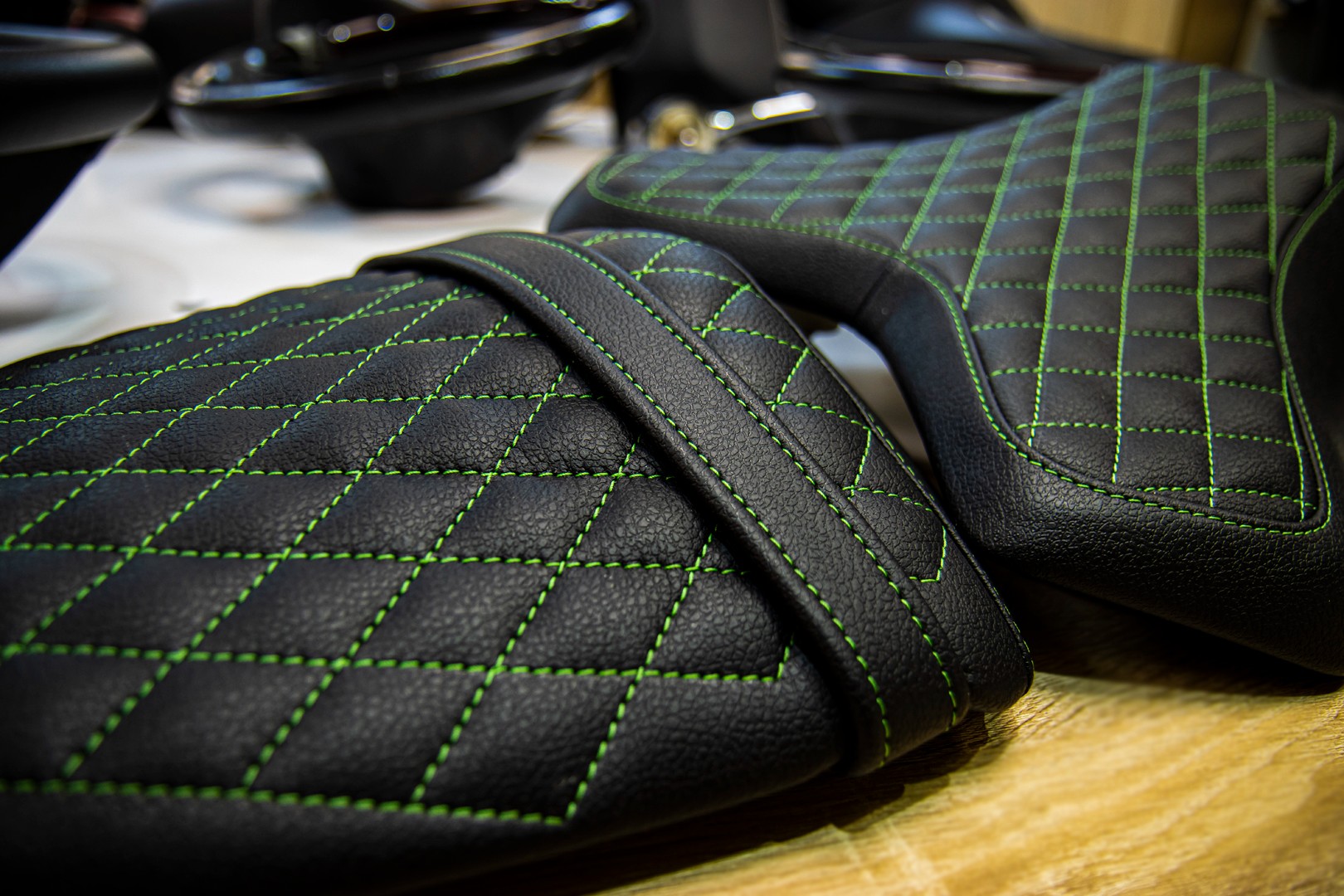 Пошив сидения для KAWASAKI Z 750. Автомобильная эко-кожа (крупная текстура) + настрочка ромб. Отделочная строчка зеленого цвета.